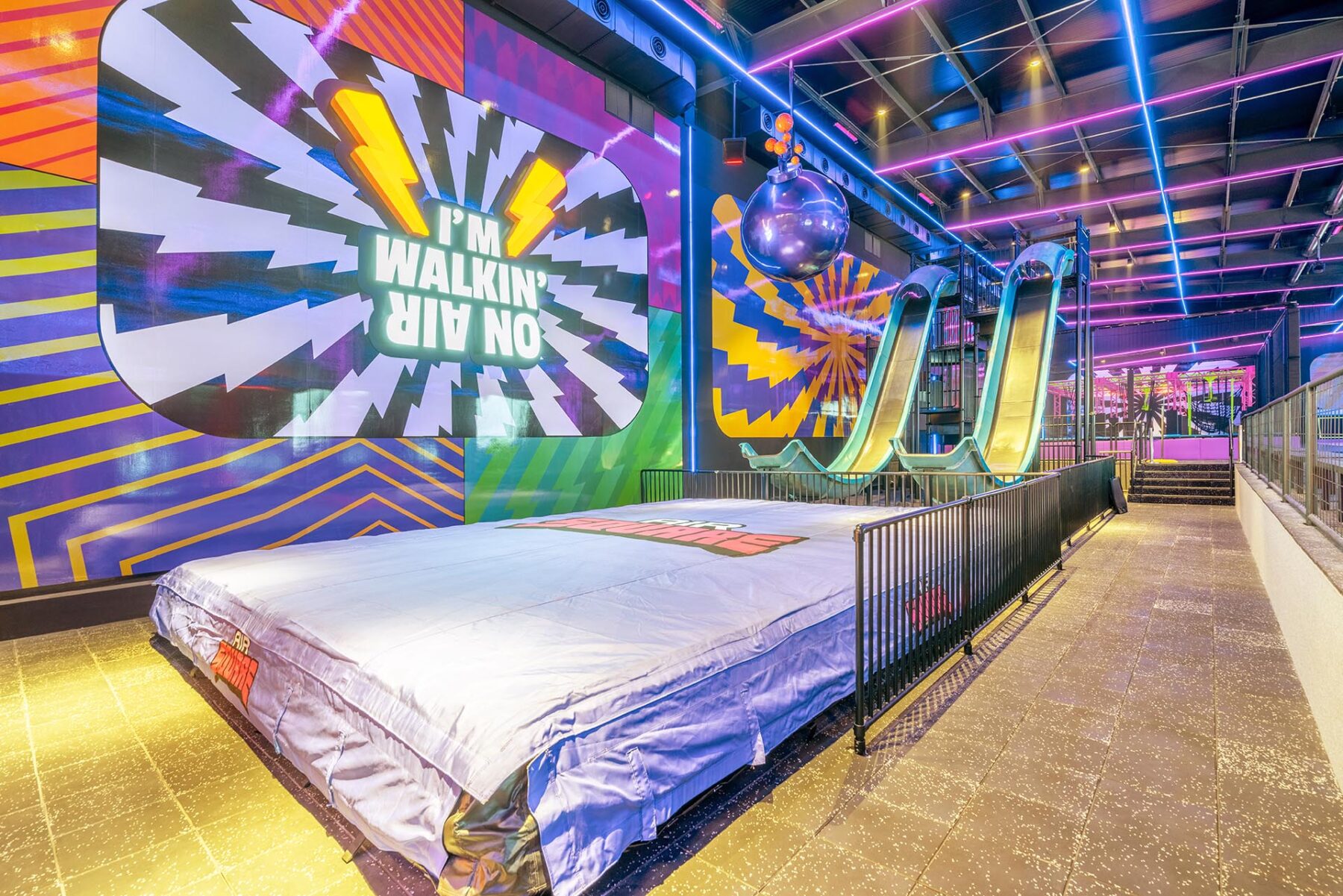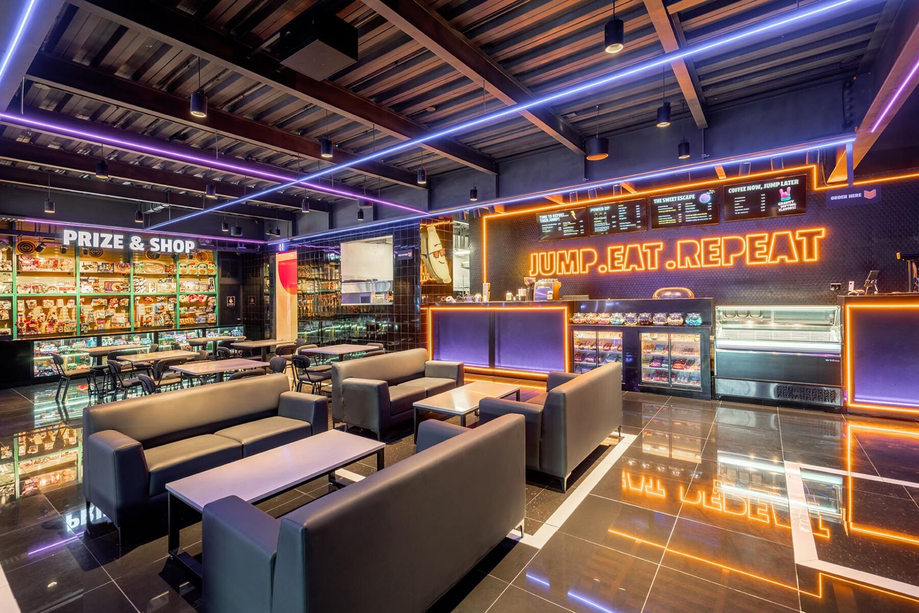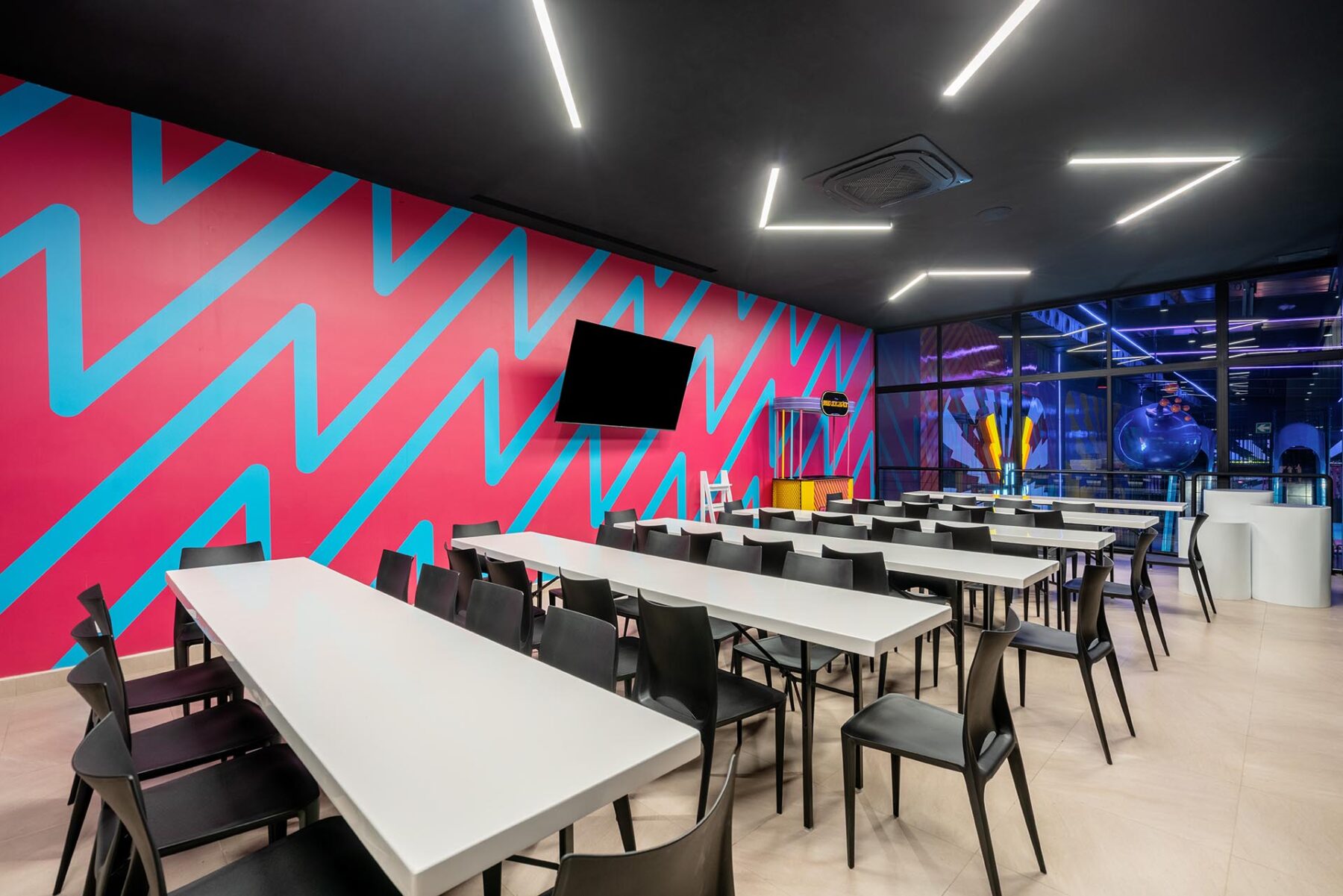 Los murales, la iluminación y los gráficos están inspirados en el movimiento, la velocidad y la adrenalina. Las líneas geométricas, los contrastes y los patrones generan una sensación de ritmo constante que acompaña cada actividad. Elementos como el resbaladero, las camas elásticas y las estructuras elevadas crean distintos niveles de interacción, permitiendo que niños y adultos exploren el lugar desde el juego. El mobiliario y los acabados refuerzan un lenguaje contemporáneo, lúdico y enérgico, dando como resultado un espacio inmersivo donde la arquitectura invita a moverse, descubrir y compartir.