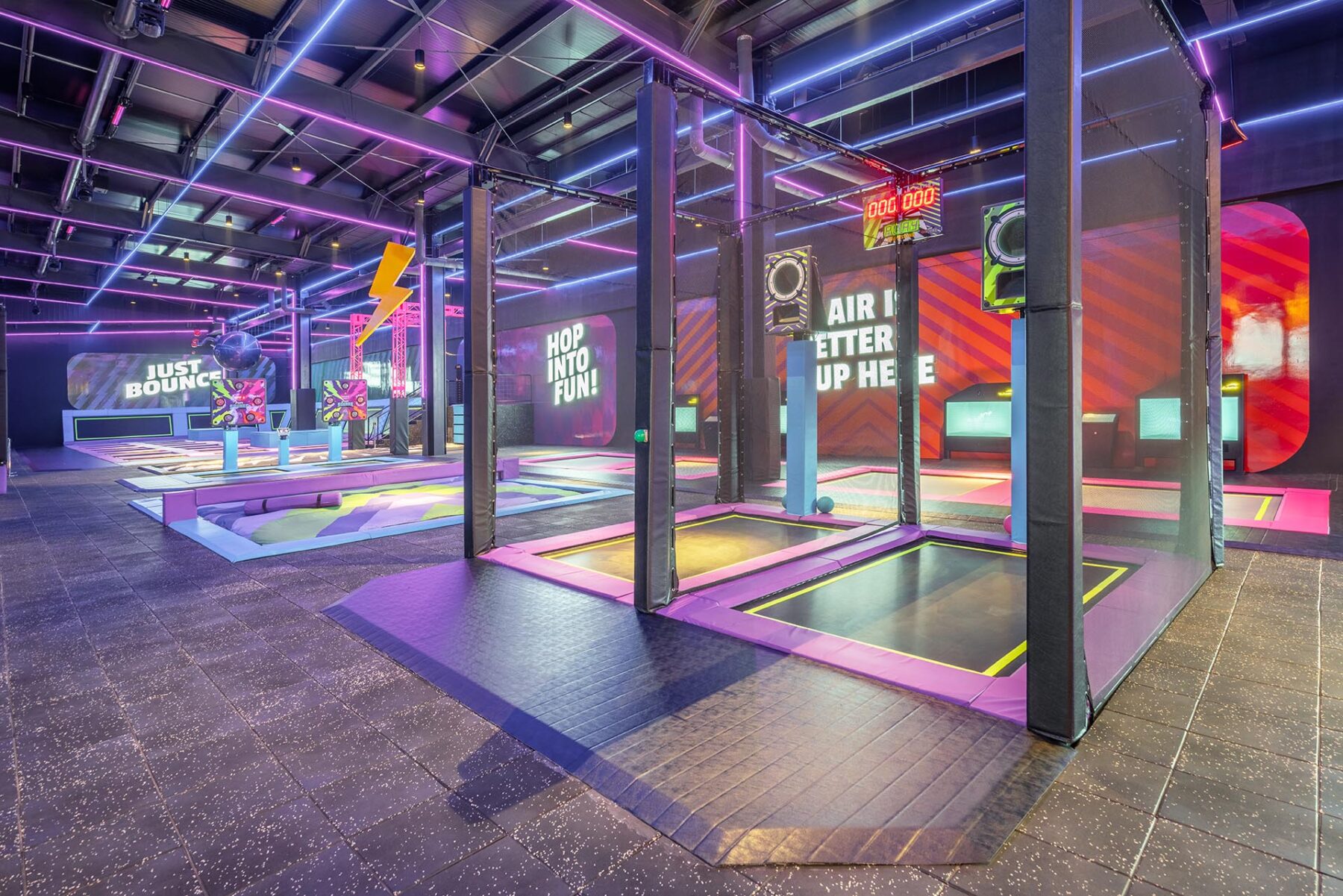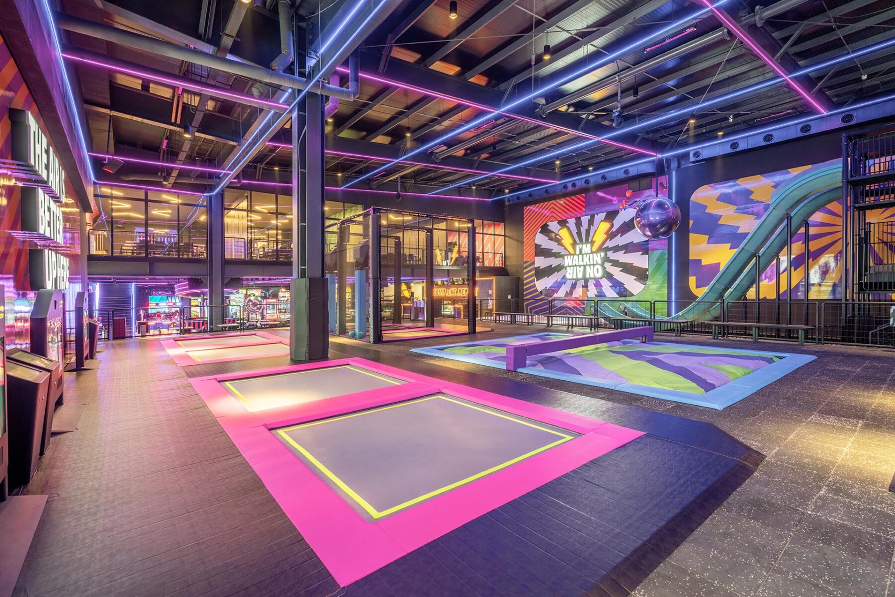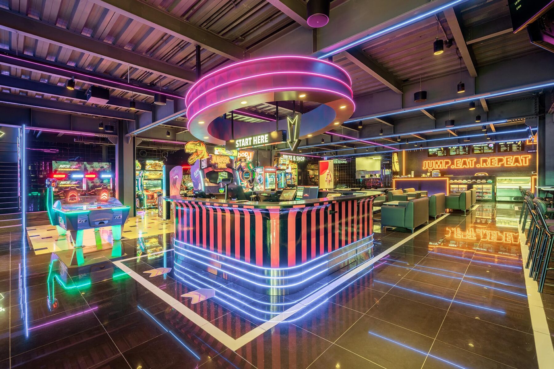 Los murales, la iluminación y los gráficos están inspirados en el movimiento, la velocidad y la adrenalina. Las líneas geométricas, los contrastes y los patrones generan una sensación de ritmo constante que acompaña cada actividad. Elementos como el resbaladero, las camas elásticas y las estructuras elevadas crean distintos niveles de interacción, permitiendo que niños y adultos exploren el lugar desde el juego. El mobiliario y los acabados refuerzan un lenguaje contemporáneo, lúdico y enérgico, dando como resultado un espacio inmersivo donde la arquitectura invita a moverse, descubrir y compartir.
