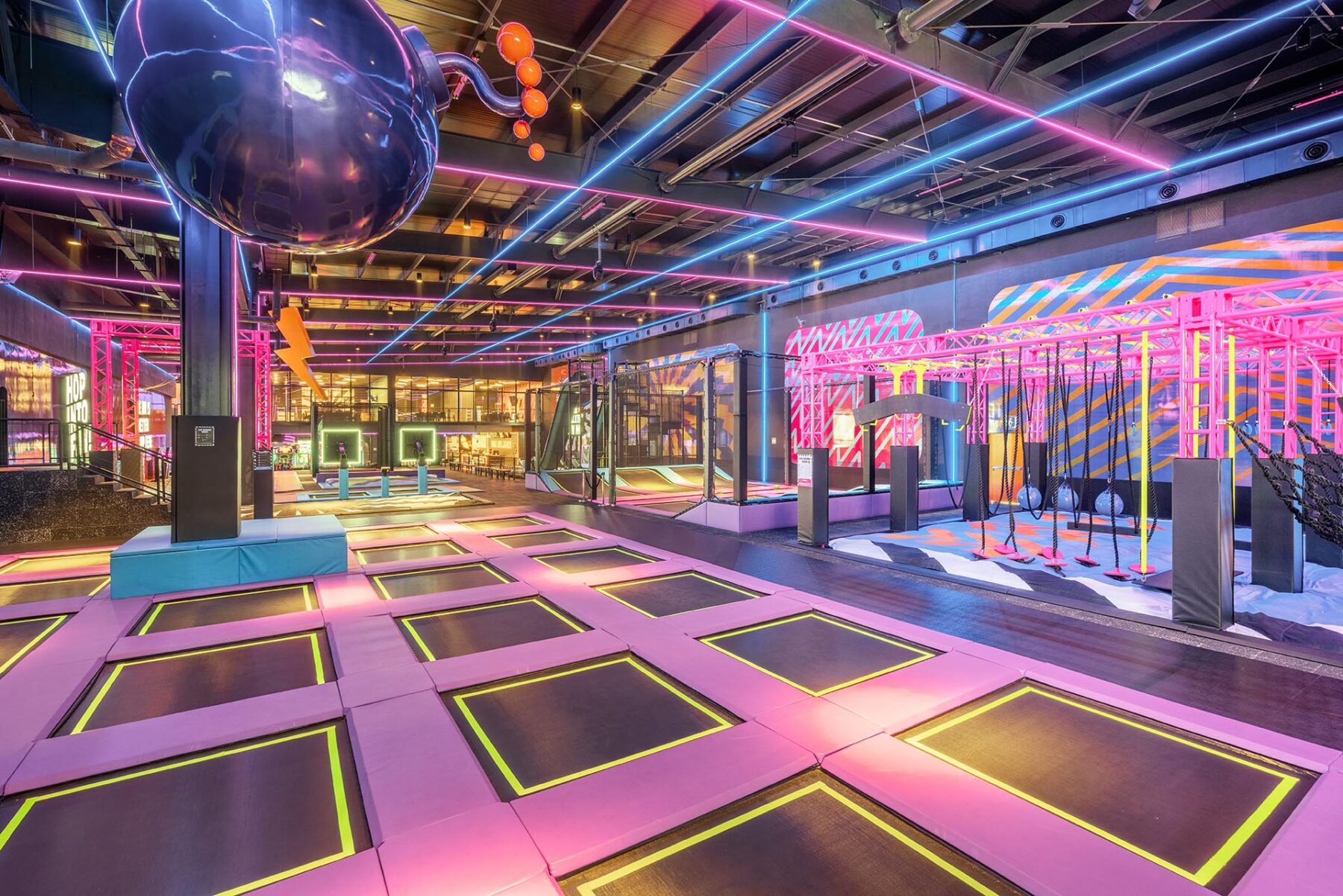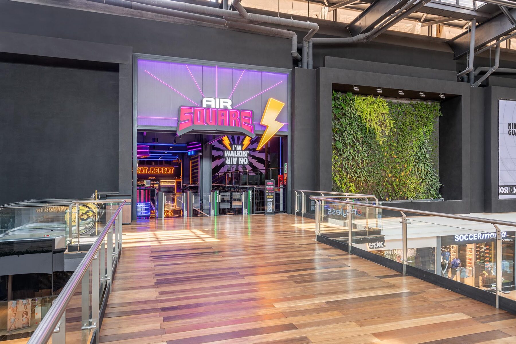 Airsquare en Oakland Place es un espacio recreativo interior enfocado en la actividad física y la diversión, donde la arquitectura se convierte en parte de la experiencia. El reto principal del proyecto fue el manejo de la energía visual y la circulación, manteniendo un equilibrio entre estímulo y orden. Esto se logra a través de una composición clara de zonas de juego, recorridos amplios y una paleta vibrante aplicada de forma estratégica en muros, techos y elementos gráficos. De esta manera, el color guía al usuario, resalta las áreas de acción y genera una atmósfera dinámica sin saturar el espacio.