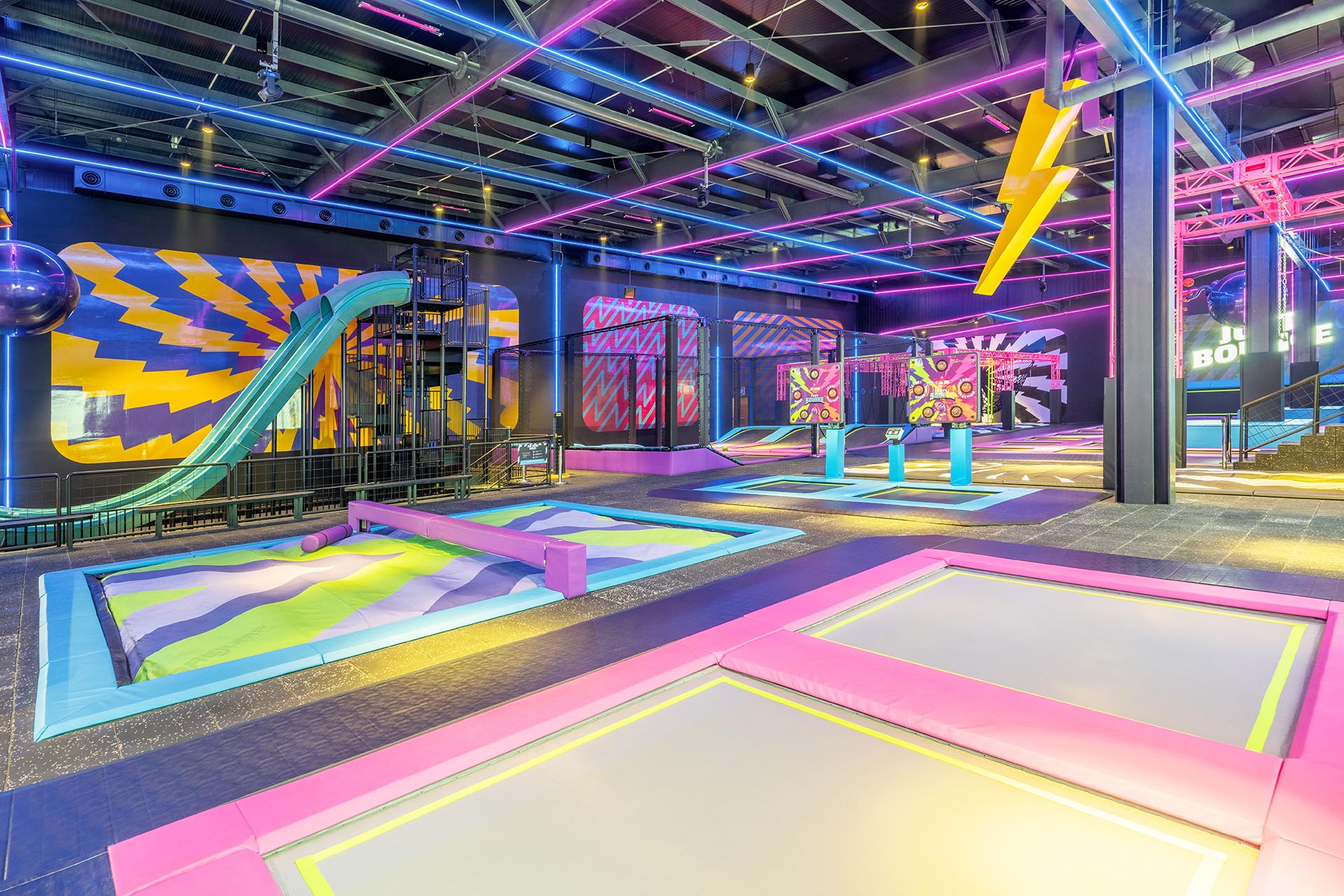 Los murales, la iluminación y los gráficos están inspirados en el movimiento, la velocidad y la adrenalina. Las líneas geométricas, los contrastes y los patrones generan una sensación de ritmo constante que acompaña cada actividad. Elementos como el resbaladero, las camas elásticas y las estructuras elevadas crean distintos niveles de interacción, permitiendo que niños y adultos exploren el lugar desde el juego. El mobiliario y los acabados refuerzan un lenguaje contemporáneo, lúdico y enérgico, dando como resultado un espacio inmersivo donde la arquitectura invita a moverse, descubrir y compartir.