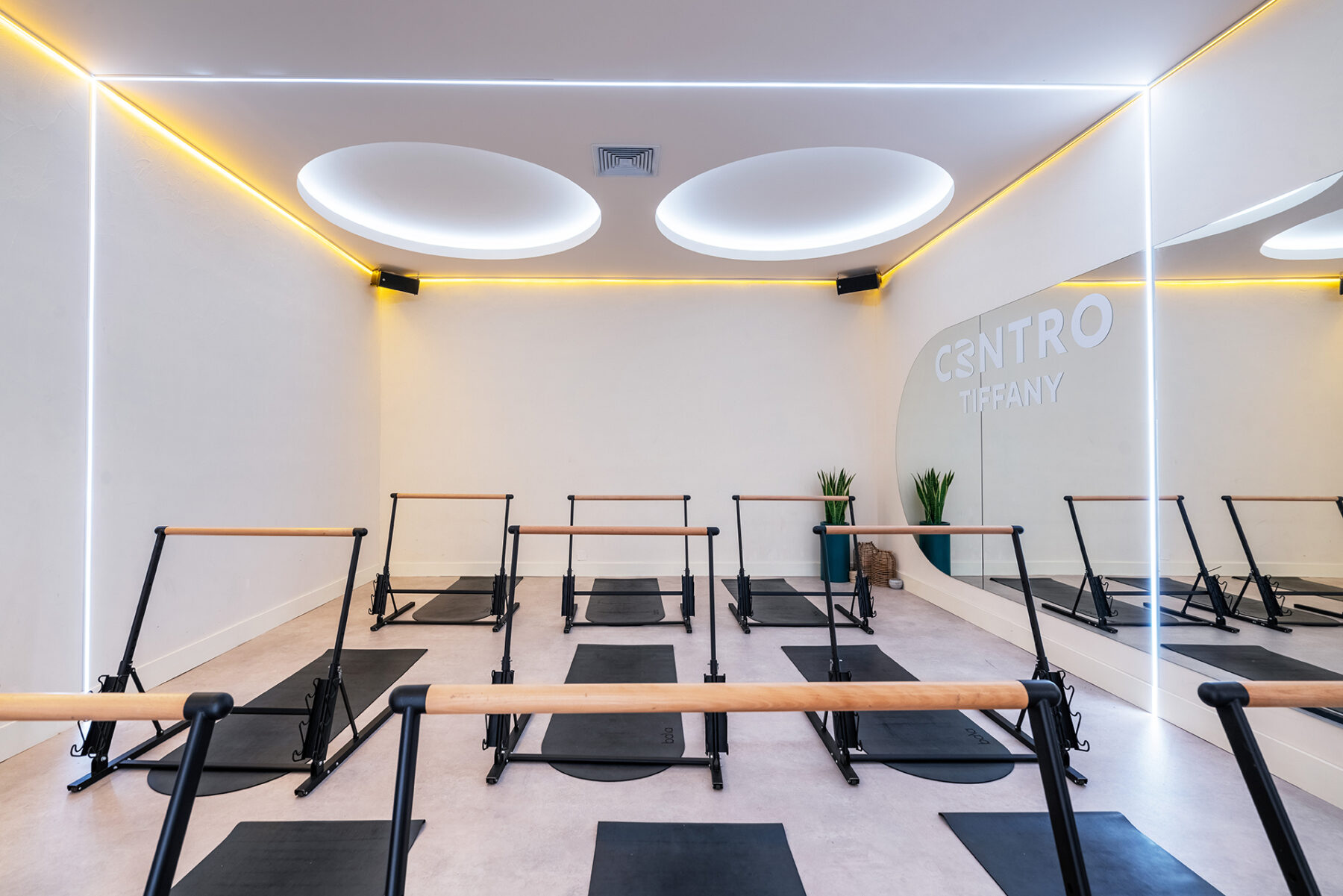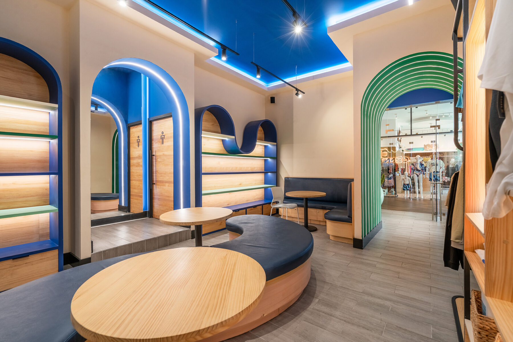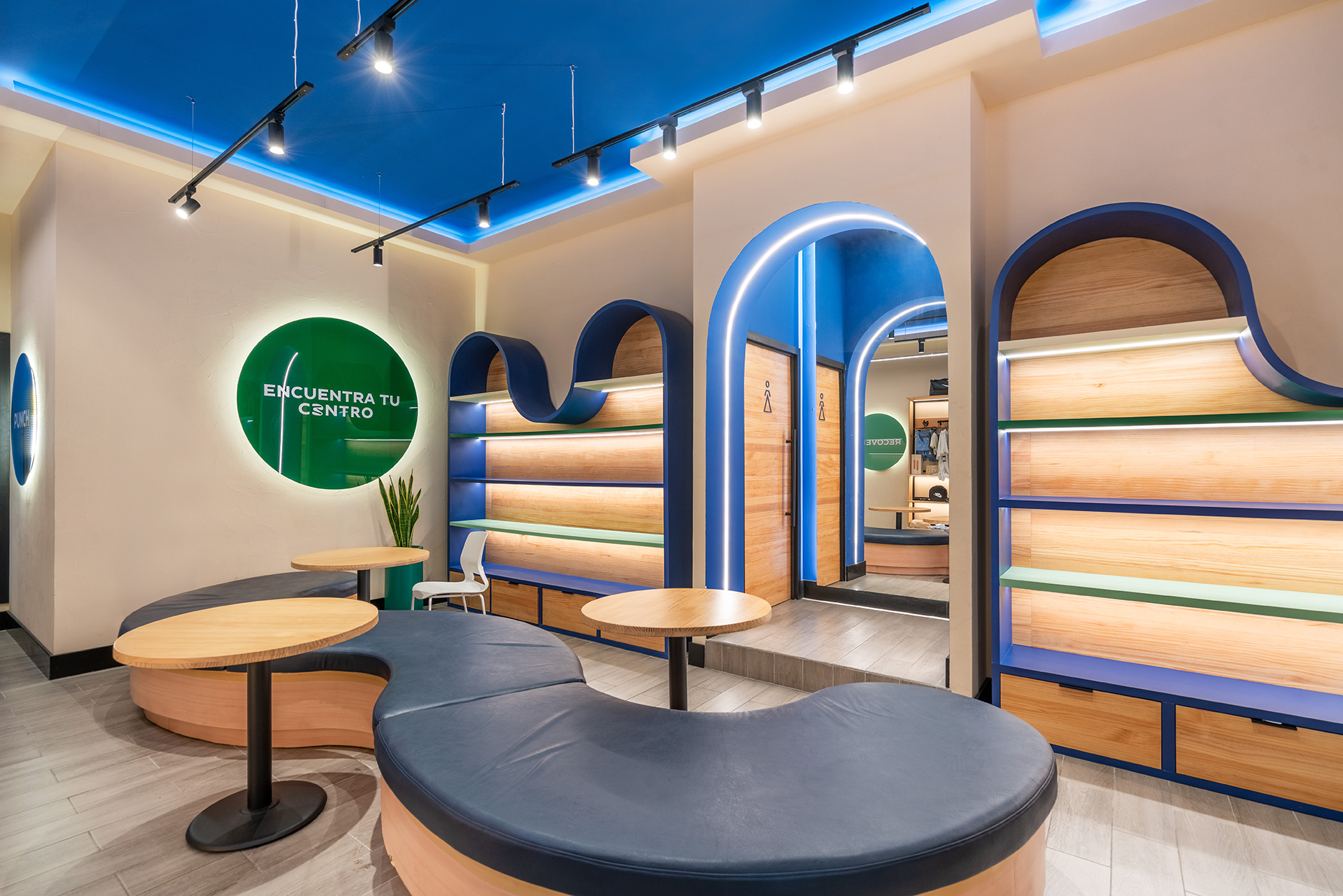 Un estudio de fitness de alto rendimiento que redefine la experiencia del bienestar a través de un diseño mderno y trendy. El reto de este espacio es el equilibrio entre la energía y la sofisticación; con mucha presencia de colores vibrantes en tonos azules y turquesas, pero sobria a la vez, gracias al contraste con muros neutros y una iluminación lineal precisa. Se observa en la aplicación geométrica de los arcos y el mobiliario curvo, que guía el flujo del usuario de manera natural hacia la acción.