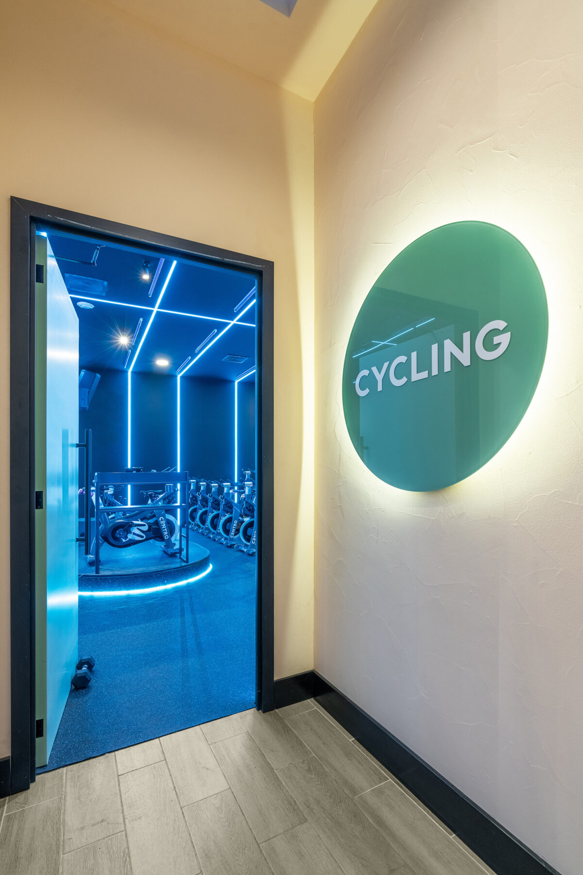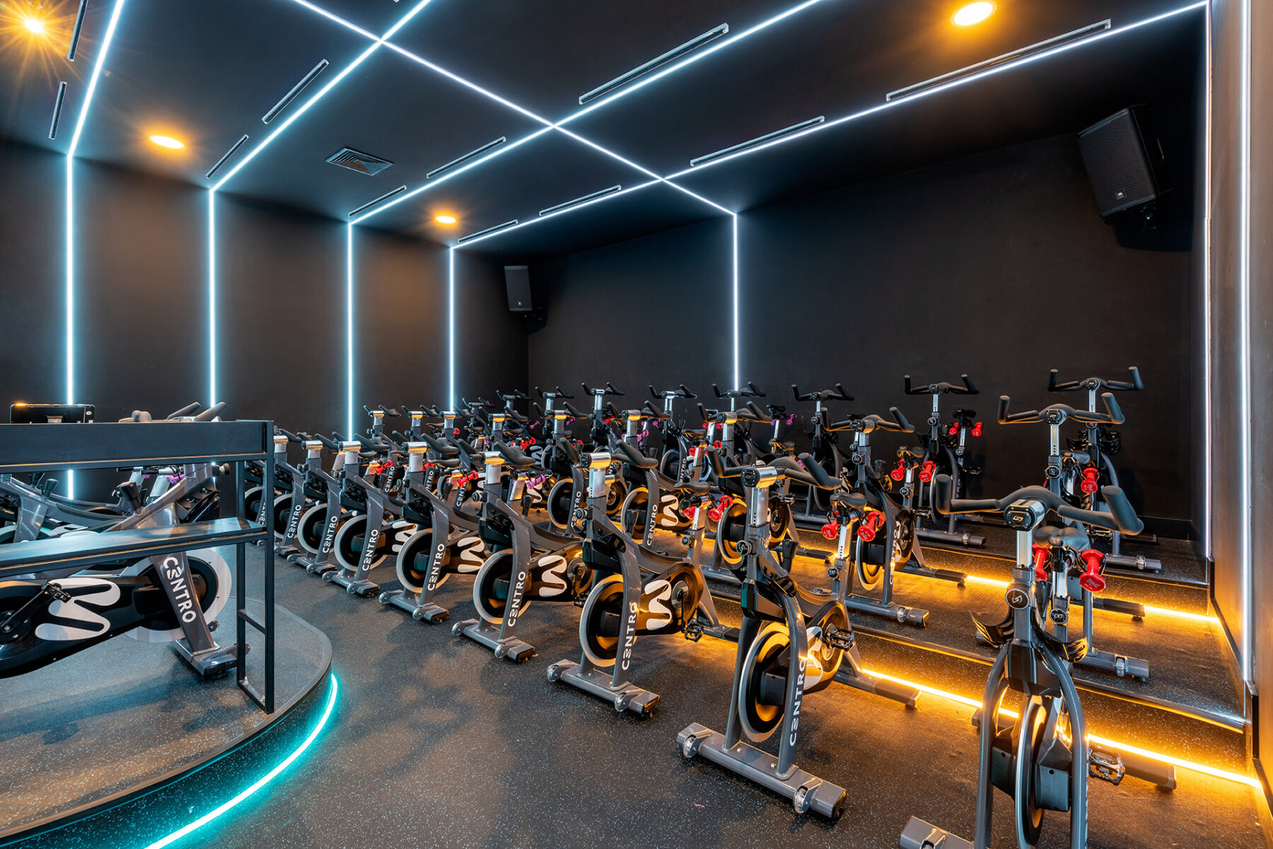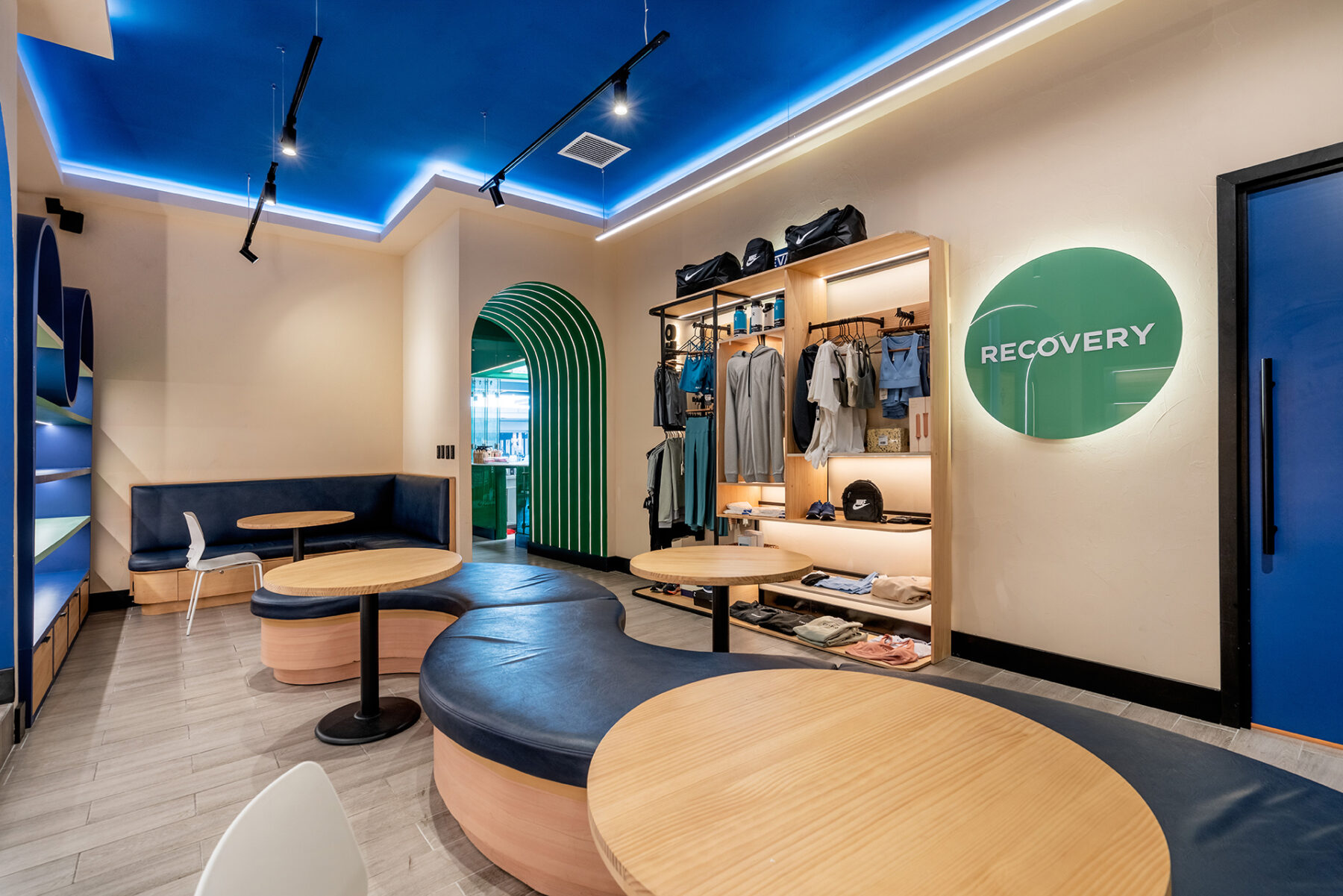 Un estudio de fitness de alto rendimiento que redefine la experiencia del bienestar a través de un diseño mderno y trendy. El reto de este espacio es el equilibrio entre la energía y la sofisticación; con mucha presencia de colores vibrantes en tonos azules y turquesas, pero sobria a la vez, gracias al contraste con muros neutros y una iluminación lineal precisa. Se observa en la aplicación geométrica de los arcos y el mobiliario curvo, que guía el flujo del usuario de manera natural hacia la acción.