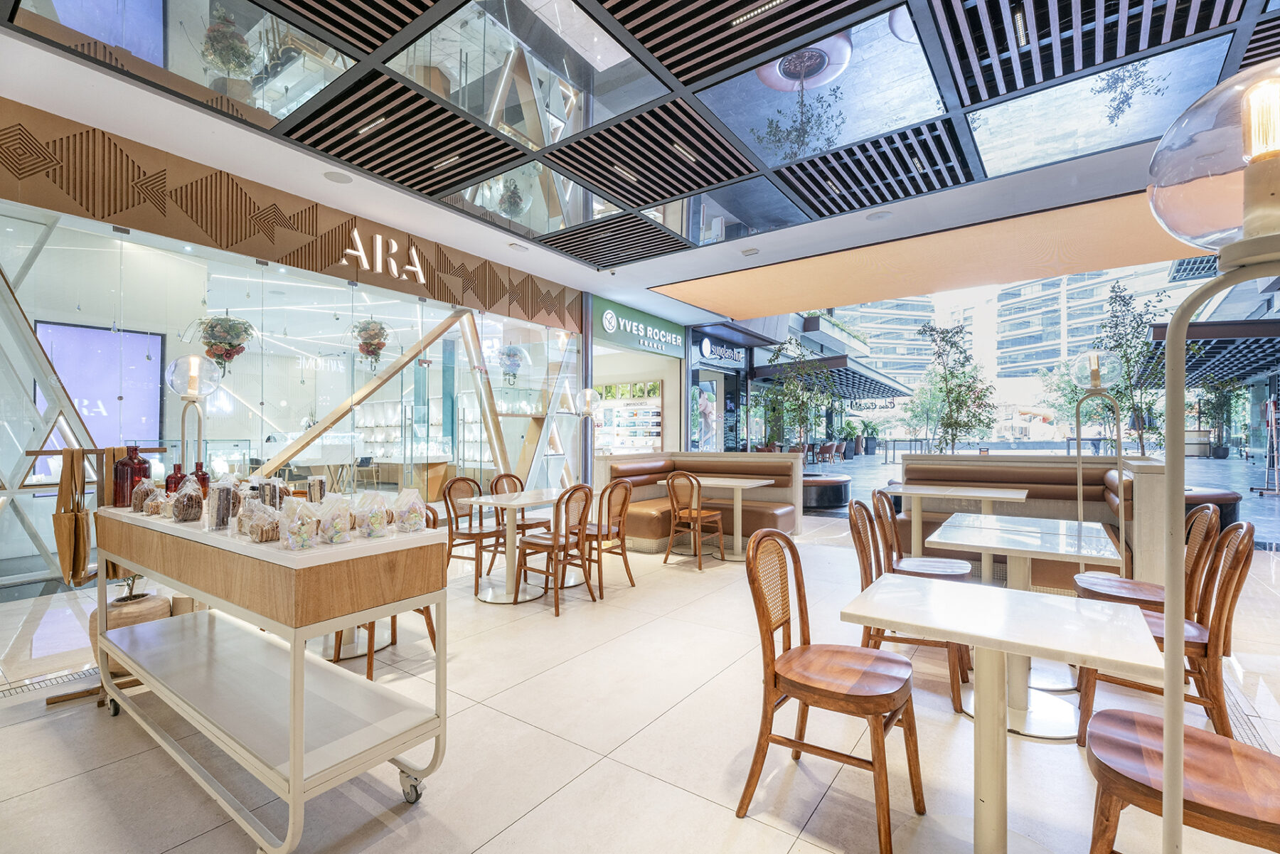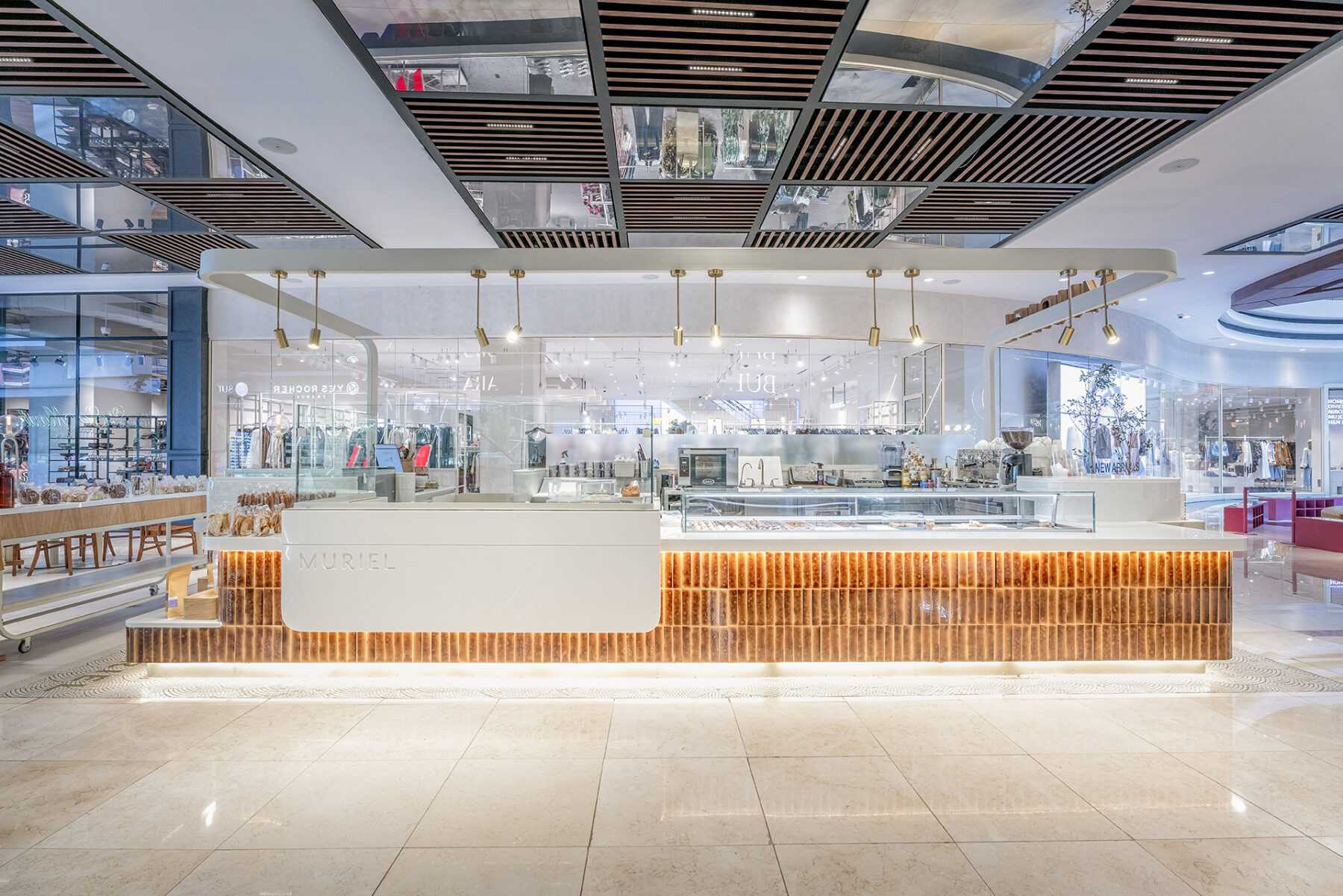 El concepto está inspirado en la ligereza y la dulzura de sus creaciones. Los detalles en bronce de la iluminación puntual y el revestimiento estriado de la base están inspirados en la precisión de la alta pastelería. El cuestionamiento de cómo crear un refugio visual en medio de un flujo constante de personas da vida a una estructura de arcos minimalistas y un techo de rejilla de madera que define el área sin cerrarla. Resultando en un conjunto disruptivo y enérgico; con una exhibición frontal que invita al descubrimiento. El mobiliario y el diseño permiten que en el espacio se respire una armonía moderna y sofisticada.